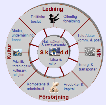 För att få information om sambanden mellan skyddssektorn (i mitten av figuren) och andra verksamheter i samhället: klicka på aktuell eker.
